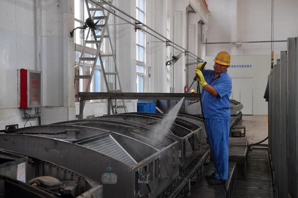 為迎接暑運(yùn)的到來,中國鐵路鄭州局集團(tuán)有限公司鄭州客車車輛段的工作人員加班加點(diǎn),檢修、清洗列車空調(diào),為暑運(yùn)的“清涼”保駕護(hù)航。車輛段被譽(yù)為“火車醫(yī)院”,車輛段的工作人員要定期對列車進(jìn)行檢修,以保證車輛安全、正常運(yùn)行。