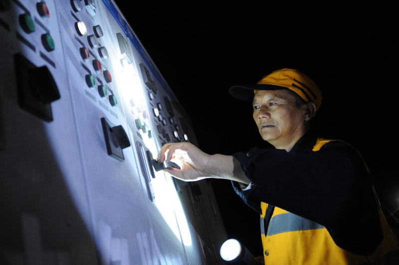養(yǎng)護(hù)工人吳瑞青在新關(guān)角隧道內(nèi)檢查控制風(fēng)扇的設(shè)備。
