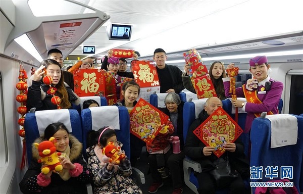 在貴陽北開往寧波的G2334列車上,乘務員為旅客送上春聯、福字掛歷和生肖豬玩偶等新年禮品。(來源:新華社)