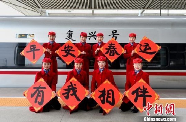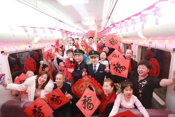 合肥客運段工作人員在G266次列車上為旅客送“福”字。(來源:新華社)