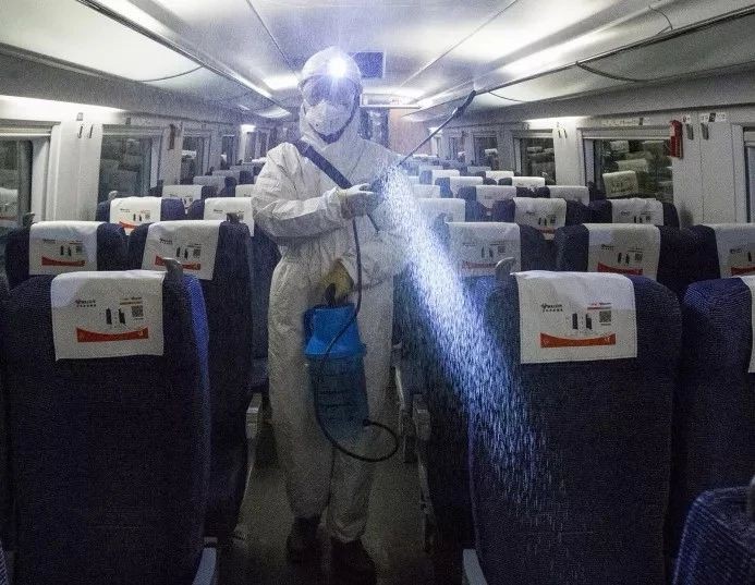 2月3日,西安,防疫部門對動車組車廂內部進行全覆蓋消毒處理。中國鐵路西安局集團公司 王曙天 攝