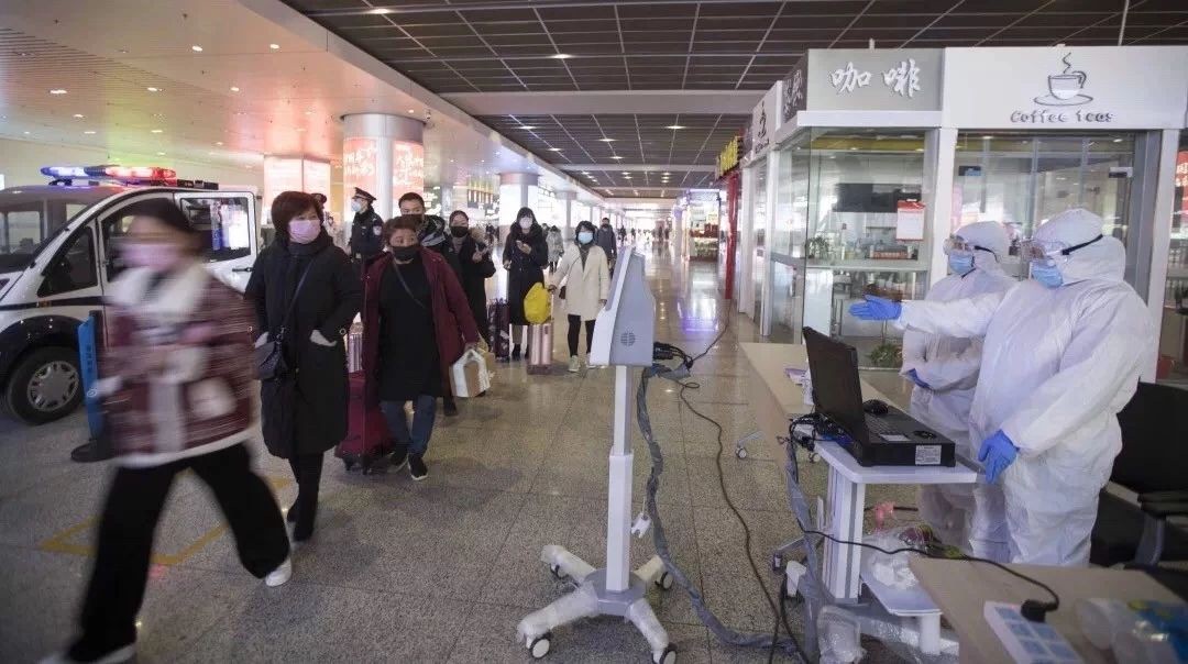 1月31日,天津西站客運人員對進出站旅客進行體溫檢測,做到一個不漏。中國鐵路北京局集團公司 楊寶森 攝