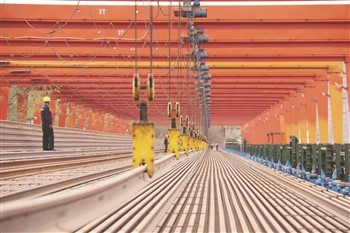 蘭州工務機械段焊軌車間鋼軌焊接工吊裝鋼軌至長軌運輸車。