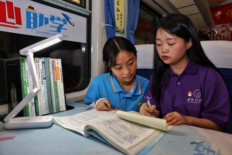 西安理工大學的志愿者給乘車孩子們講解習題。