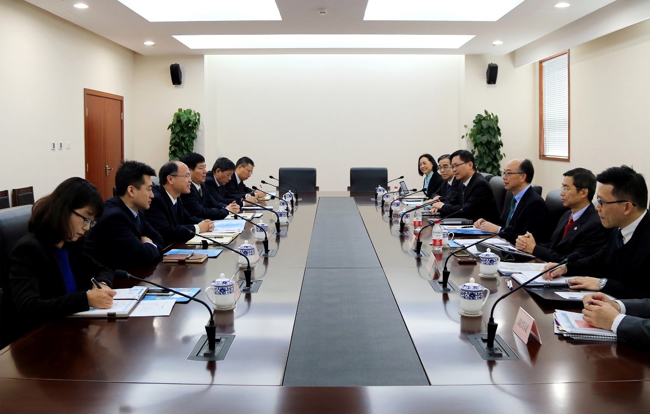 11月1日,國家鐵路局副局長蘇全利(左三)在北京會見了香港特別行政區政府機電工程署署長陳帆(右三)一行。雙方就內地與香港機車車輛駕駛資格互認、港方動車組駕駛人員考試及雙方共同關心的其他合作交流事宜交換了意見。