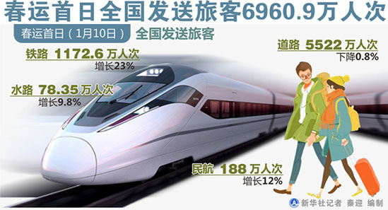 春運(yùn)首日全國(guó)發(fā)送旅客6960.9萬(wàn)人次