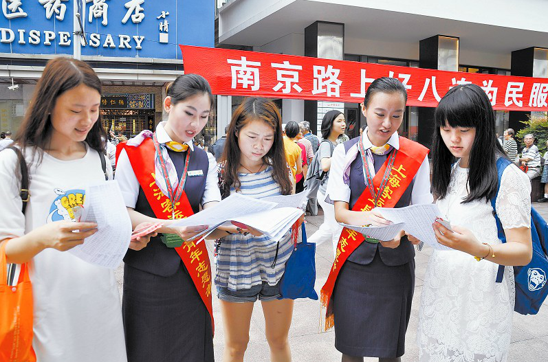 上海客運(yùn)段高鐵二車隊(duì)組織青年志愿者走上街頭,在南京路步行街向市民介紹暑運(yùn)動(dòng)車組列車開行信息,并發(fā)放簡(jiǎn)明時(shí)刻表。 圖片攝影:張錦渭