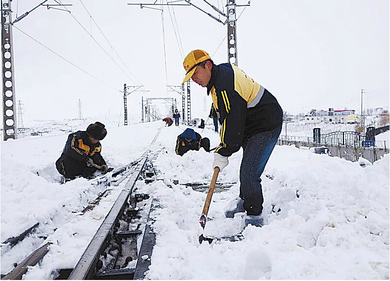 圖為集寧工務段職工正在清除線路上的積雪。張旭東 攝