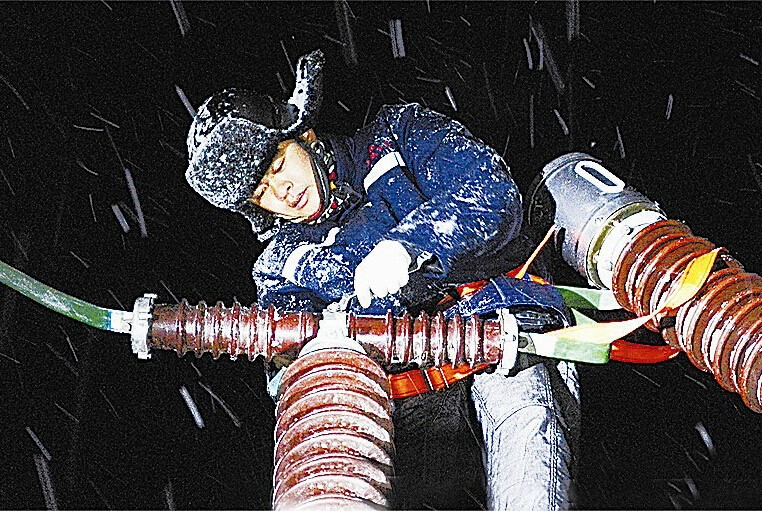 圖為西寧供電段西寧檢修車間職工冒雪在高空檢修鐵路供電設備。嚴永虎 攝