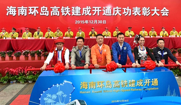 12月30日,海南環島高鐵西段開通運營,與2010年12月開通運營的海南環島高鐵東段實現連通,標志著全球首條環島高鐵全線貫通,旅客乘高鐵環游海南島成為現實。海南環島高鐵西段北起海口市,南至三亞市,經過澄邁、臨高、儋州、昌江、東方、樂東6個市縣,全長345公里,設計速度200公里/小時,對加快形成海島“三小時經濟圈”、推進國際旅游島建設具有重要意義。圖為海南環島高鐵地方代表和中國鐵建的高鐵建設者們共同推桿啟動西環高鐵開通。