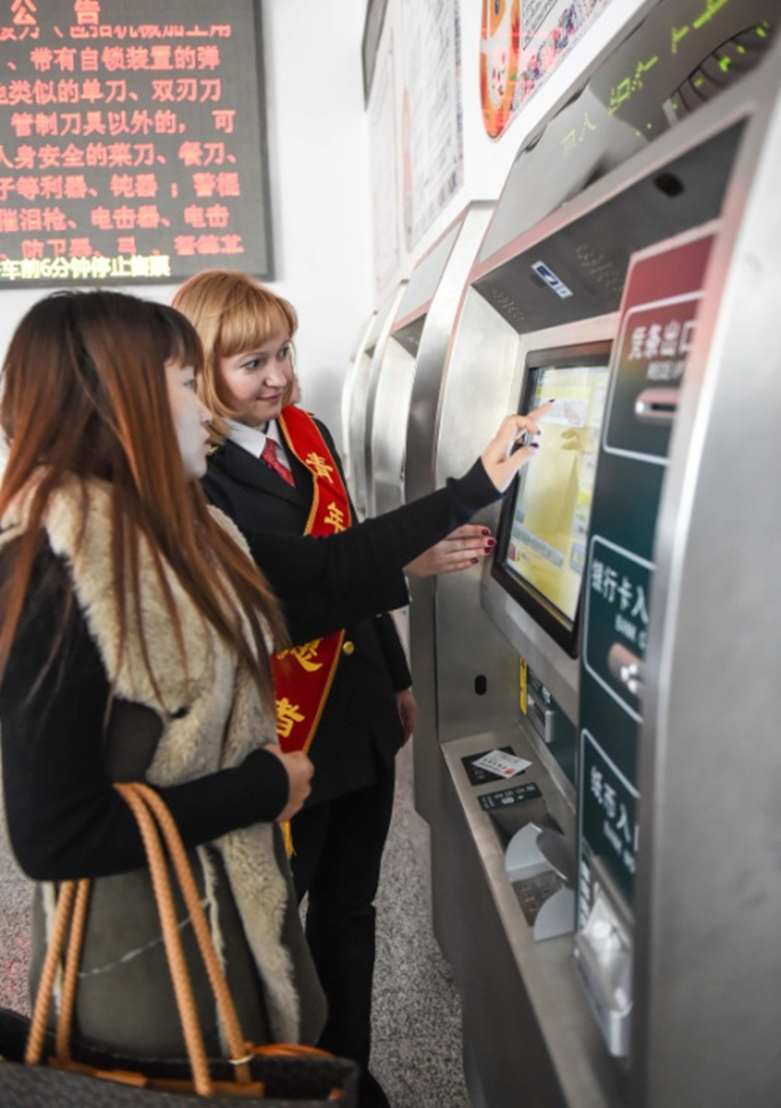 1月27日,來自俄羅斯符拉迪沃斯托克的志愿者瑪麗婭(右)在引導旅客取票。