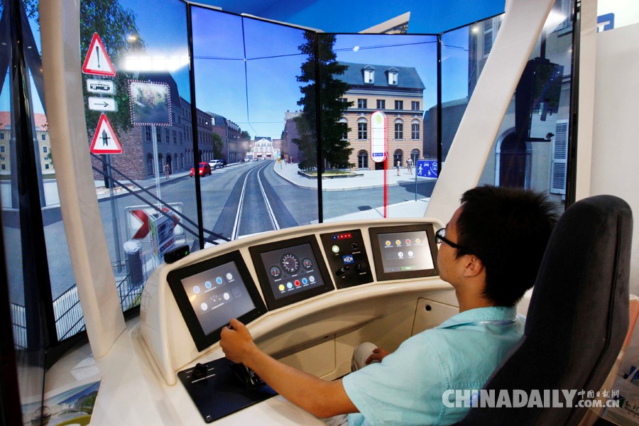 圖為觀眾體驗克諾爾駕駛模擬器。這一模擬器基于實(shí)車數(shù)據(jù)和經(jīng)驗進(jìn)行模擬,動感直觀。