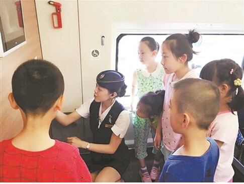 在G605次“晉之星”列車上,乘務員耐心地給小旅客講解安全知識。楊娜 攝(圖片來源:人民鐵道報)
