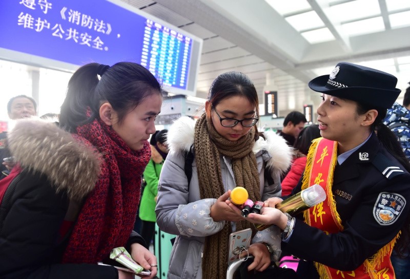 公安民警在合肥南站向旅客介紹哪些物品禁止攜帶上車。劉軍喜 攝