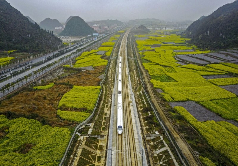 近日,貴州安順油菜花開,高鐵列車穿行其間,構成一幅幅美麗圖畫。圖為3月16日,一列動車組列車在滬昆高鐵貴州安順段行駛。