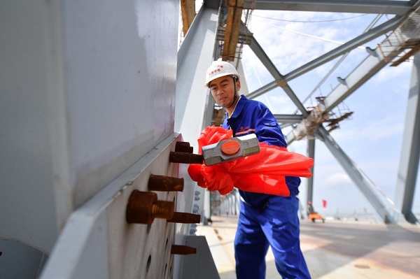 蒙華鐵路洞庭湖大橋上的工人正在敲入沖釘。