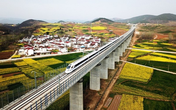 在貴州省凱里市,鐵路旁邊春花開(kāi)放,動(dòng)車組列車行駛在芬芳中。吳吉斌 攝