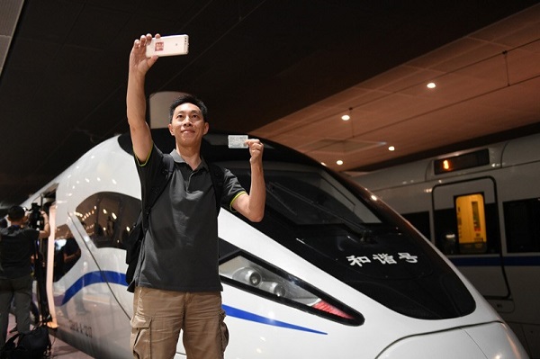 2018年9月23日,廣深港高鐵全線開通,搭乘G5711次高鐵列車前往香港西九龍站的乘客在深圳北站拍照留念。