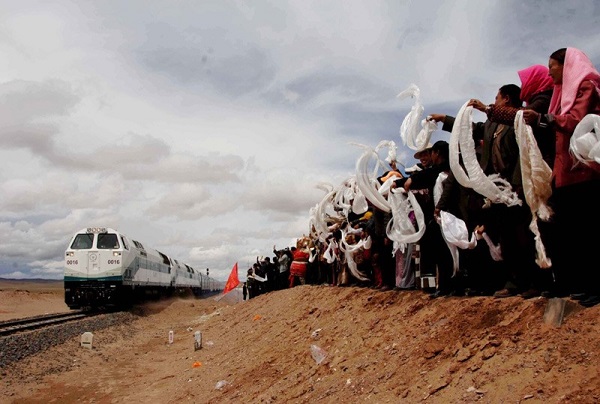 2006年7月1日,青藏鐵路全線通車,在位于青海境內的沱沱河大橋橋頭,當地群眾歡迎從格爾木出發的“青1”次列車。