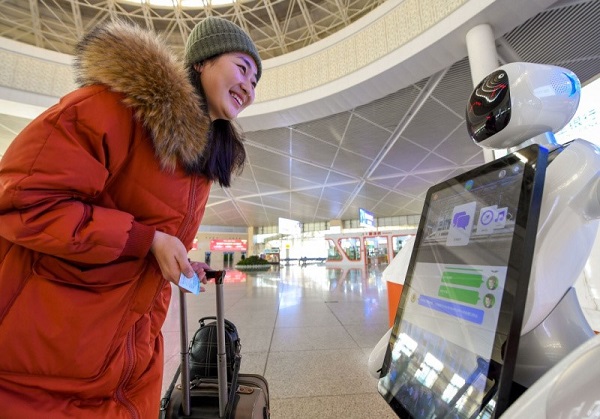 旅客在呼和浩特火車東站與智能機(jī)器人交流。(來源:新華社)
