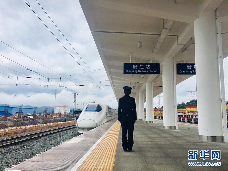 10月14日13時18分,黔張常鐵路聯(lián)調(diào)聯(lián)試首趟動車DJ5502組徐徐駛?cè)肭?,標志著黔張常鐵路黔江段正式進入試運行階段。