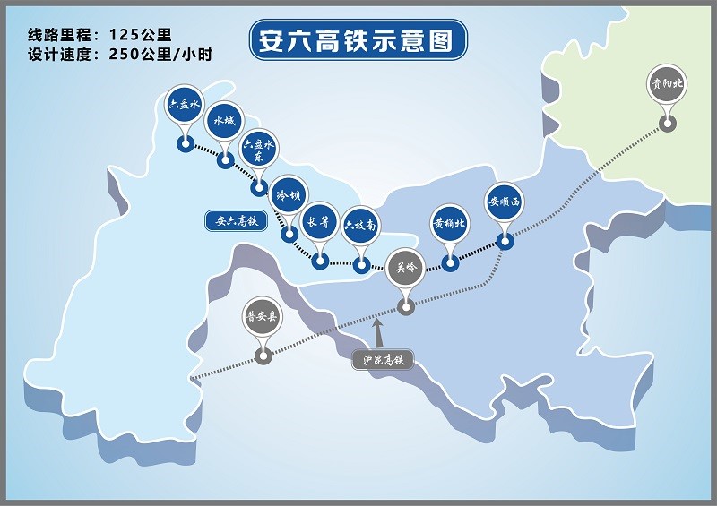 安六高鐵是貴州省首條時速250公里的城際鐵路,為滬昆高鐵的延伸和補充,也是貴州省快速城際鐵路網的重要組成部分,通過滬昆高鐵連接起了貴陽、安順、六盤水三個重要城市,沿線旅游資源豐富,民族風情濃郁,歷史文化燦爛。安六高鐵的開通運營,使六盤水市全面接入全國高鐵網,加快融入貴陽1小時經濟圈,對于合理引導沿線地區城鎮空間布局,促進區域經濟交流和旅游業發展,堅決打贏西部地區脫貧攻堅戰具有重要意義。