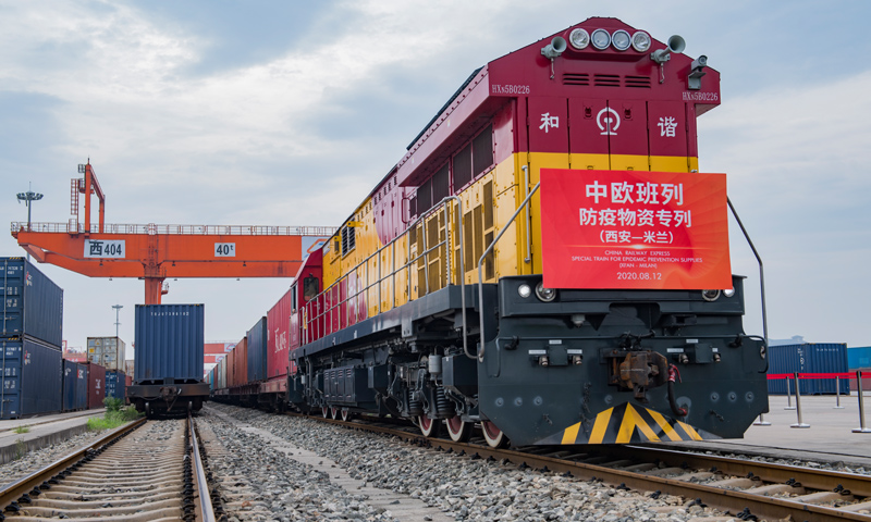 8月12日,75061次中歐班列(西安—米蘭)滿載口罩和熔噴布,從中國鐵路西安局集團(tuán)新筑車站出發(fā),駛向意大利米蘭。自新冠疫情發(fā)生以來,中歐班列(西安)共運輸防疫物資1521車,共計12719.6噸,為開展國際防疫合作提供了有力支持。
