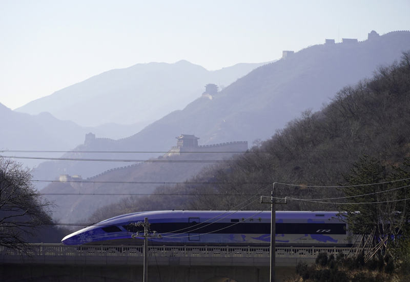 1月6日,北京冬奧列車亮相京張高鐵。該列車全部使用時速350公里復興號動車組開行,并配備5G超高清演播室。冬奧列車編組8輛,定員564人,外觀采用“瑞雪迎春”涂裝方案,彰顯冬奧主題。
