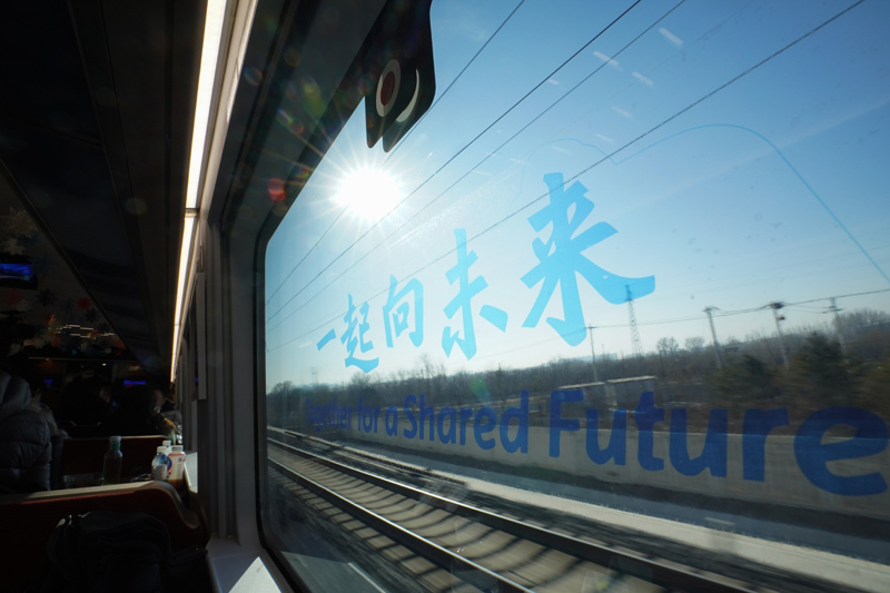 G9981次北京冬奧列車車窗上的北京冬奧會和冬殘奧會主題口號。