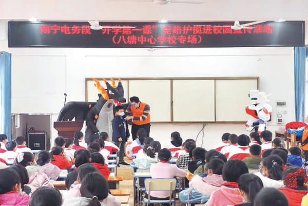 南寧電務段護路宣傳小分隊走進管內鐵路沿線學校,通過趣味性、互動性十足的護路主題真人“飛行棋”等游戲,以真人演繹、情景模擬等方式加強學生們的愛路護路意識。