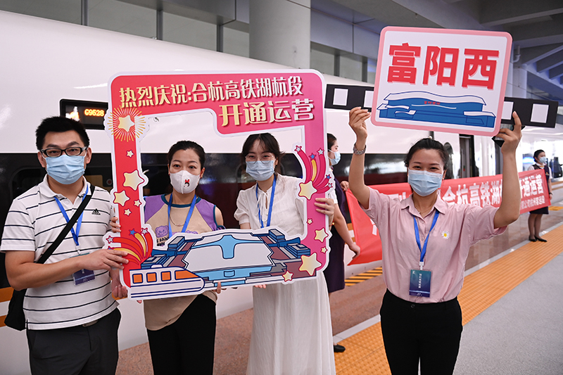 合杭高鐵湖州至杭州段首趟列車旅客在杭州西站站臺合影留念。