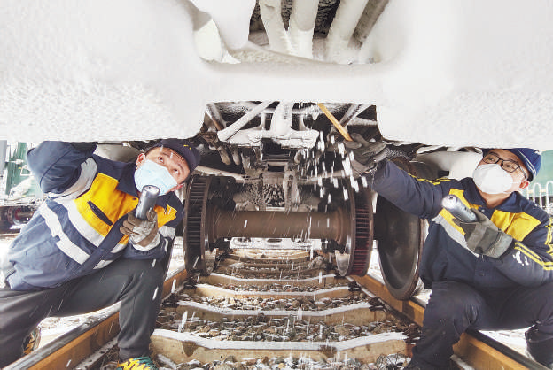 包頭車輛段職工正在清理列車走行部積雪,檢查制動系統狀態。常文斌 攝