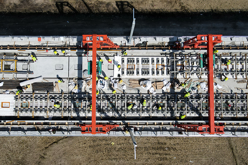 中鐵十一局池黃鐵路建設現場,工人進行無砟軌道施工作業。