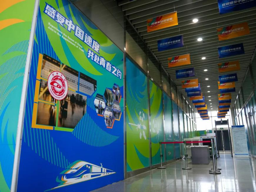 作為成都大運會官方抵離服務點的成都東站,以“感受中國速度、共赴青春之約”為主題,利用大運會主視覺體系為基底、吉祥物“蓉寶”等元素為重點打造大運會主題車站。在北進站口東側開辟大運會專用通道,方便抵離客群快速進入車站;打造大運會專用候車區,候車區內設置有抵離服務臺,提供茶點、充電寶、飲用水等,為抵離客群提供更加優質的服務保障;設置大運會吉祥物造型、大運會打卡點等。環蓉地區的成都東、成都西、成都南、雙流機場、新都東等多個車站還進行了環境衛生改善及鐵路沿線環境整治,努力創造美好溫馨的乘車環境。