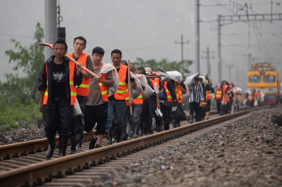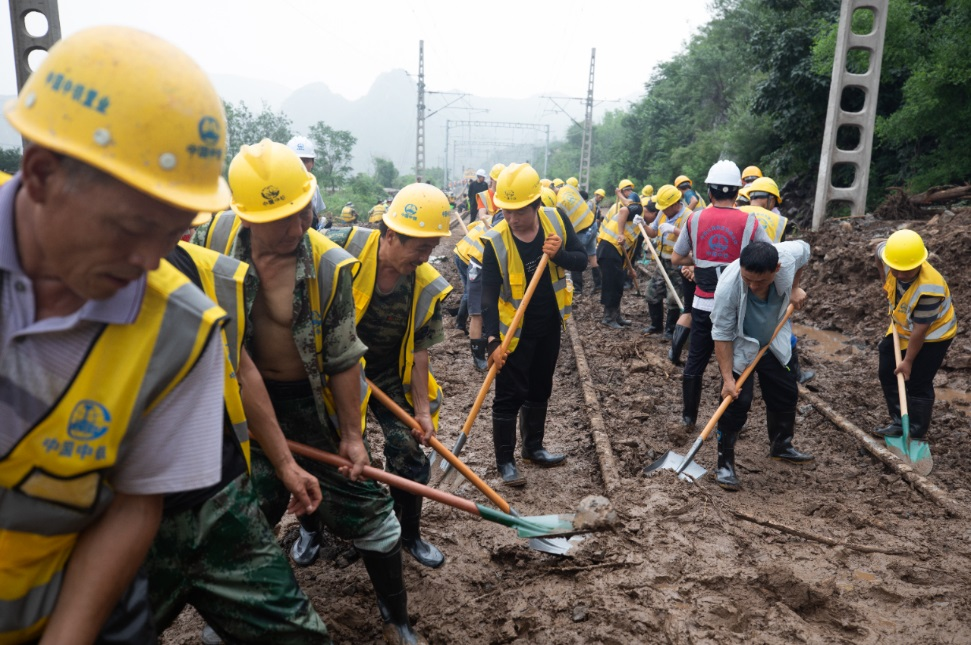 京津冀地區(qū)持續(xù)強(qiáng)降雨,導(dǎo)致北京豐臺(tái)至沙城鐵路(豐沙線)受到嚴(yán)重?fù)p毀。連日來(lái),工作人員冒雨在現(xiàn)場(chǎng)加班加點(diǎn)搶修、清淤。
