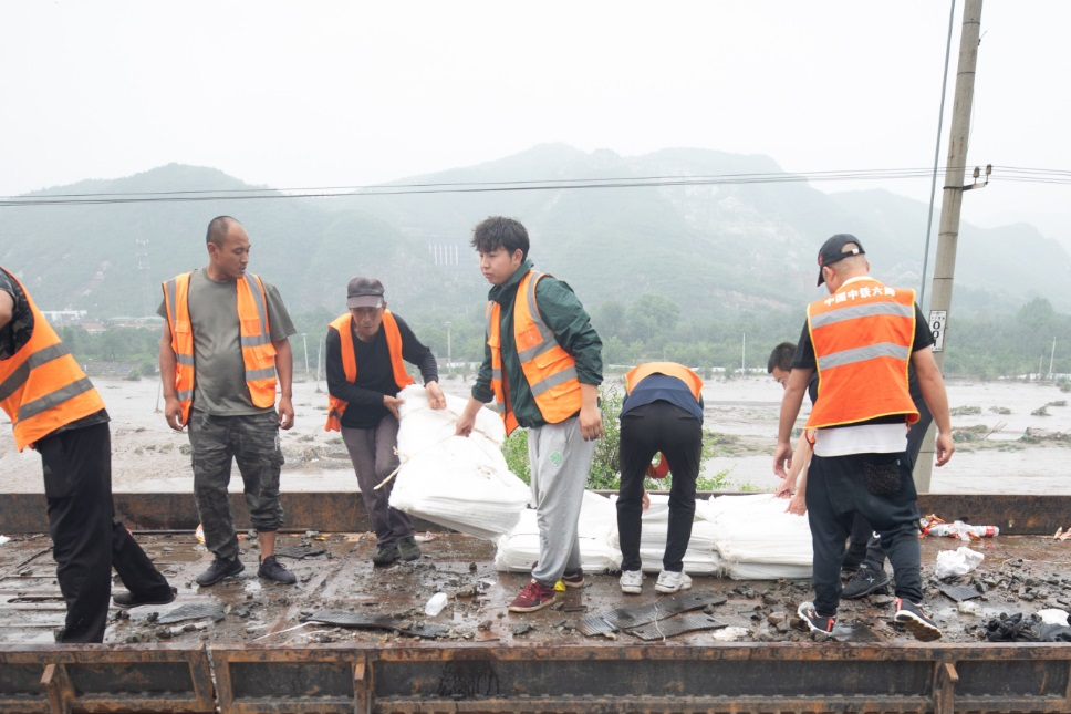 工作人員正在搬運(yùn)編織袋,用于運(yùn)送泥沙。