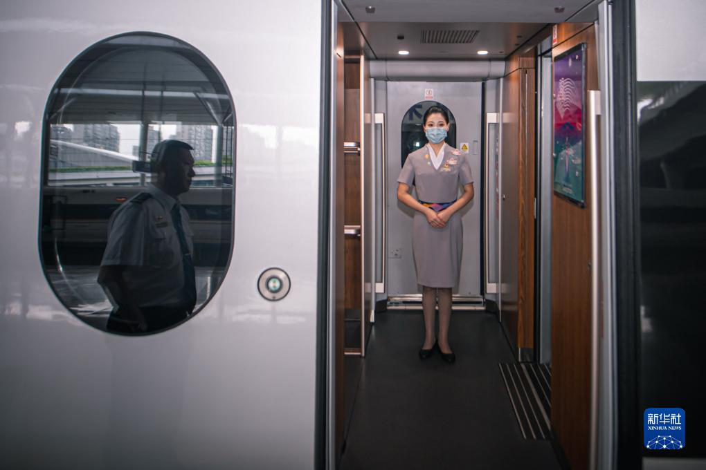 乘務(wù)員在復(fù)興號亞運智能動車組列車上準(zhǔn)備迎接乘客。