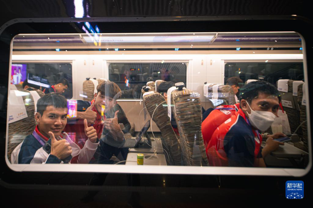 泰國體育代表團(tuán)成員乘坐復(fù)興號亞運智能動車組列車前往金華賽區(qū)。