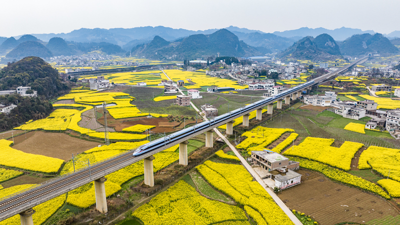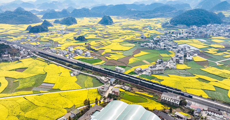 仲春時節,貴州省多地油菜花競相綻放。一趟趟列車在油菜花海之中穿行,勾勒出黔貴大地朝氣蓬勃的春日景象。