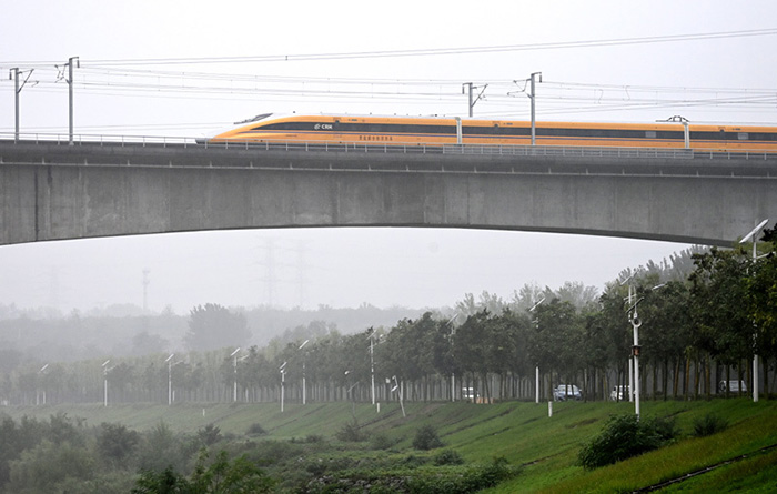 聯調聯試綜合檢測列車駛過位于陜西省西安市的西延高鐵渭河特大橋。
