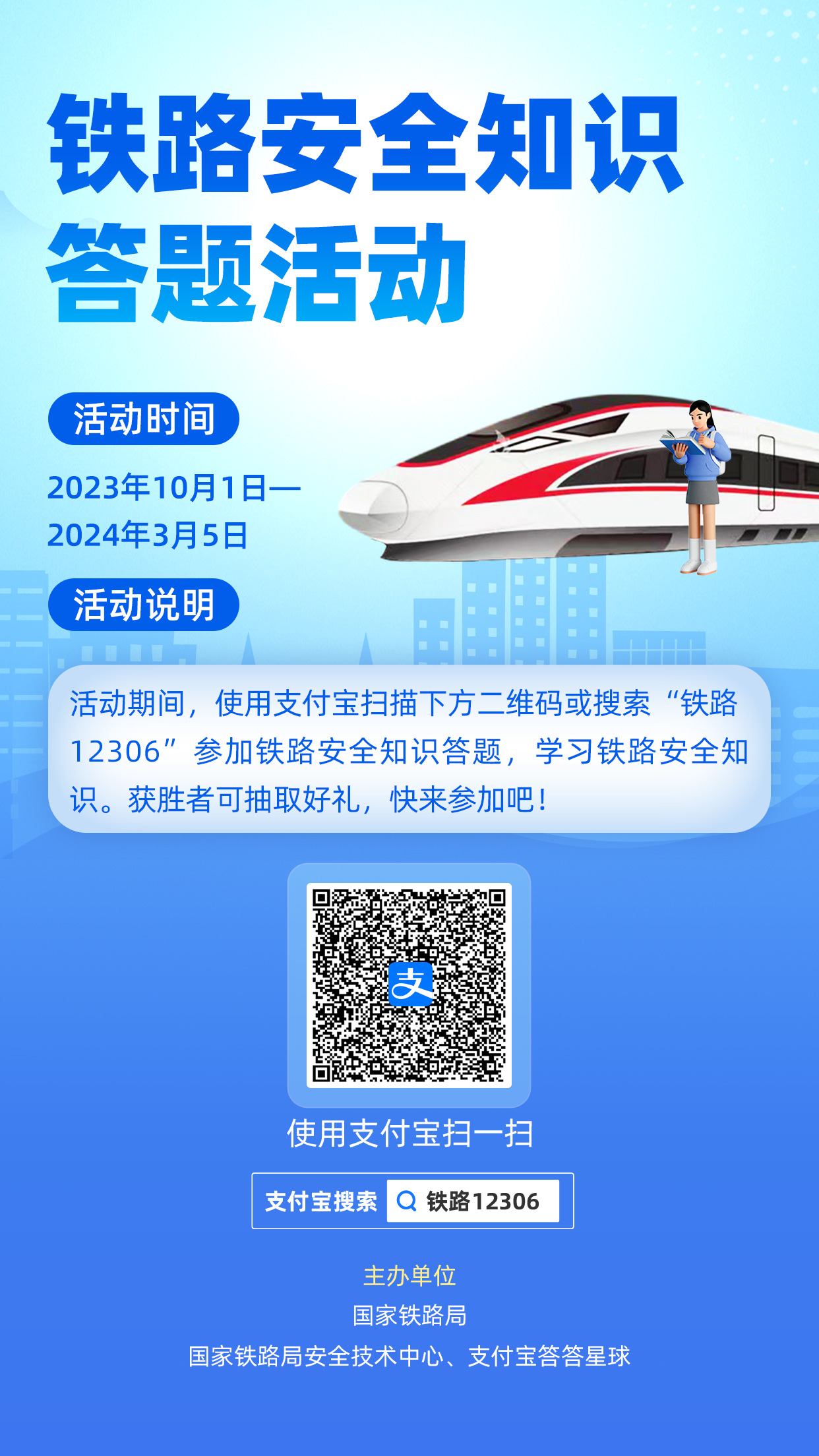 為進(jìn)一步增加社會(huì)公眾對(duì)鐵路安全知識(shí)的了解,共同維護(hù)鐵路運(yùn)輸安全,國(guó)家鐵路局正在舉辦鐵路安全知識(shí)答題活動(dòng),期待您的參與!
