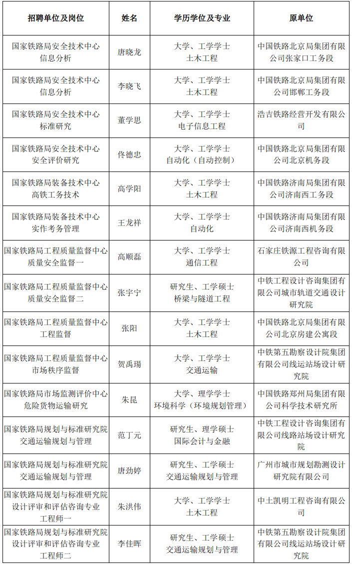 國家鐵路局事業單位面向社會公開招聘擬聘用人員公示