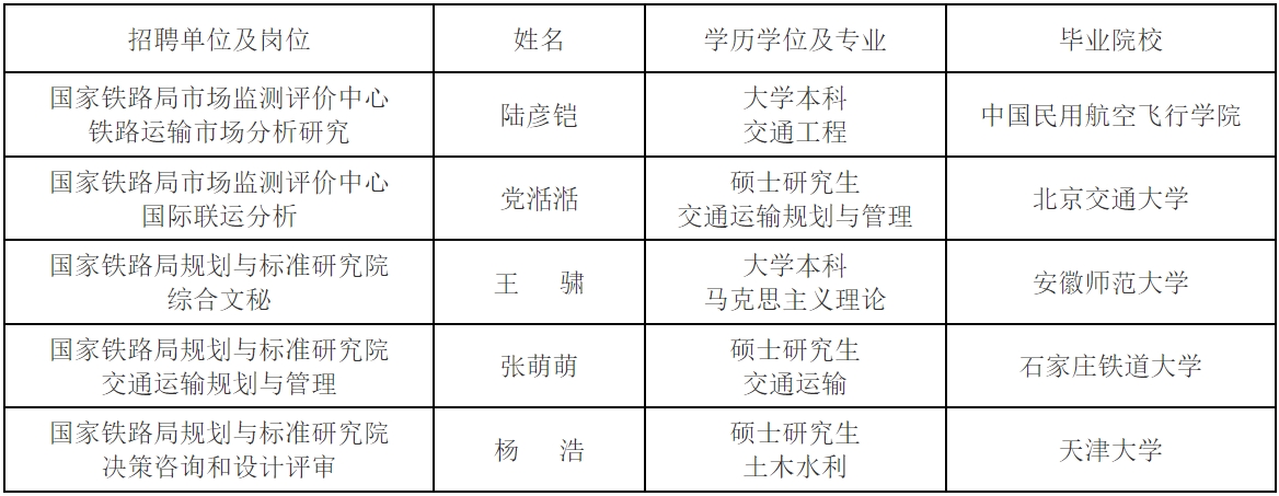 國家鐵路局事業單位2024年度公開招聘應屆畢業生擬聘用人員公示