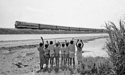 贊比亞魯西瓦西湖畔的少年兒童歡迎坦贊鐵路的列車通到他們的家鄉(1976年攝)。