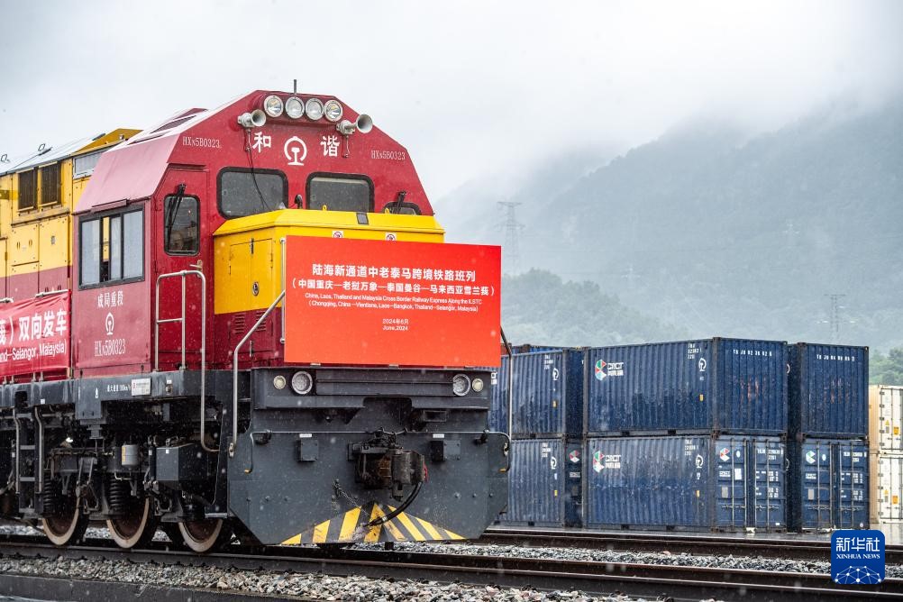 一列西部陸海新通道中老泰馬跨境鐵路班列駛出車站。