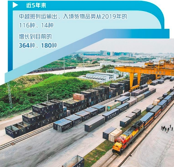 數據表明,高效、實惠、便捷的中越班列已得到市場認可。近5年來,中越班列運輸出、入境貨物品類從2019年的116種、14種,增長到目前的364種、180種。中越班列集貨地已覆蓋廣西及周邊省份20多個地市,跨境貨物運輸覆蓋越南、老撾、泰國等多個東盟國家。