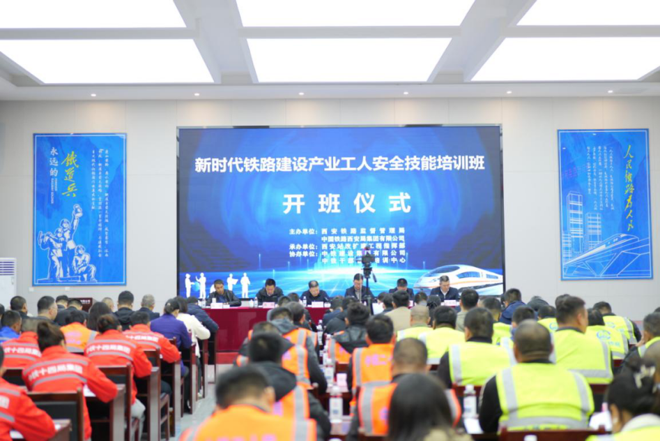 圖為西安鐵路監(jiān)管局主辦的新時(shí)代鐵路建設(shè)產(chǎn)業(yè)工人安全技能培訓(xùn)示范班開班儀式現(xiàn)場。