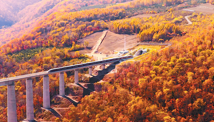 縱觀全線,在長白山余脈與遼河平原間,沈白高鐵以77%的橋隧比穿越山水。