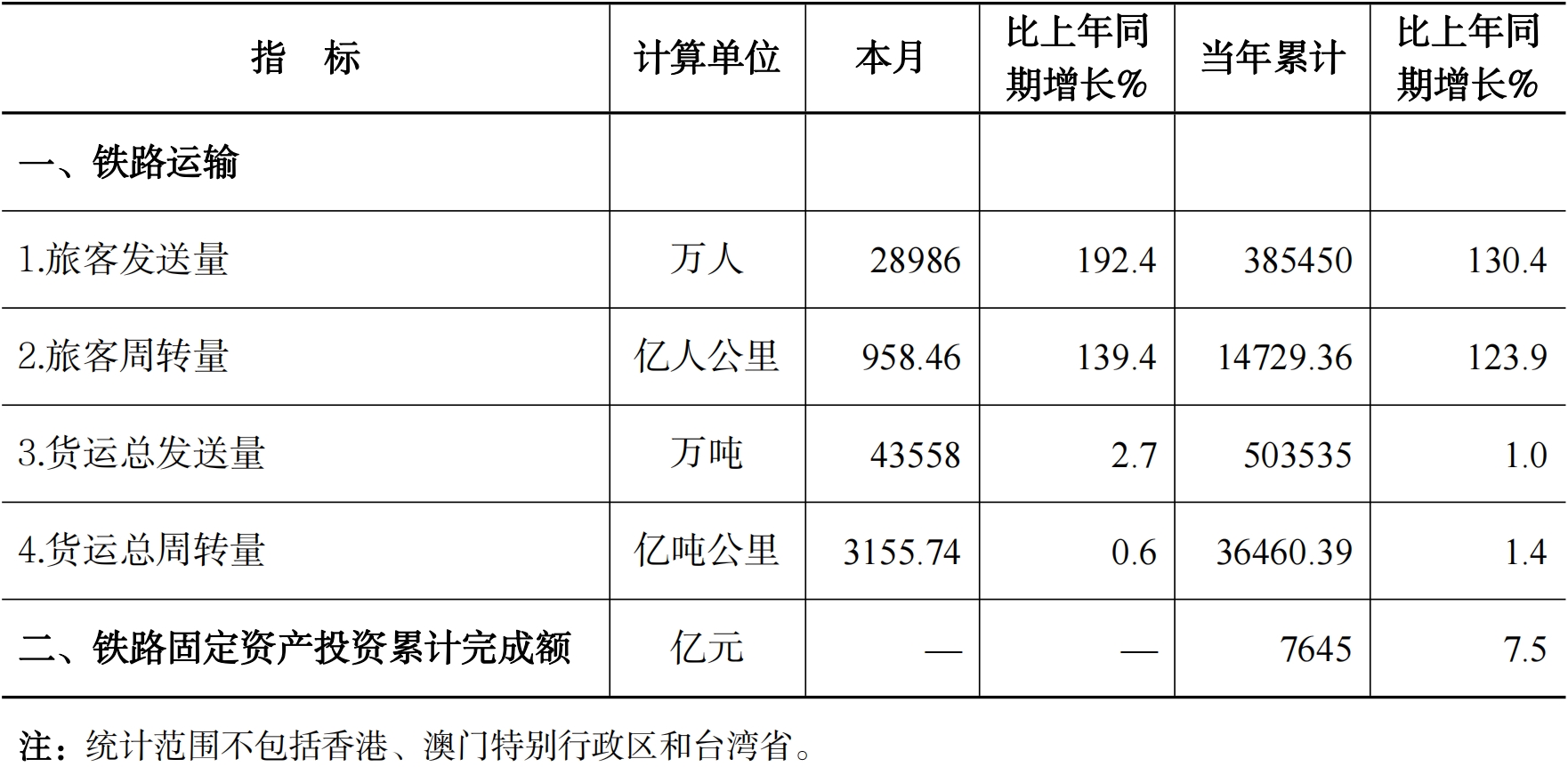 2023年12月份全國鐵路主要指標完成情況