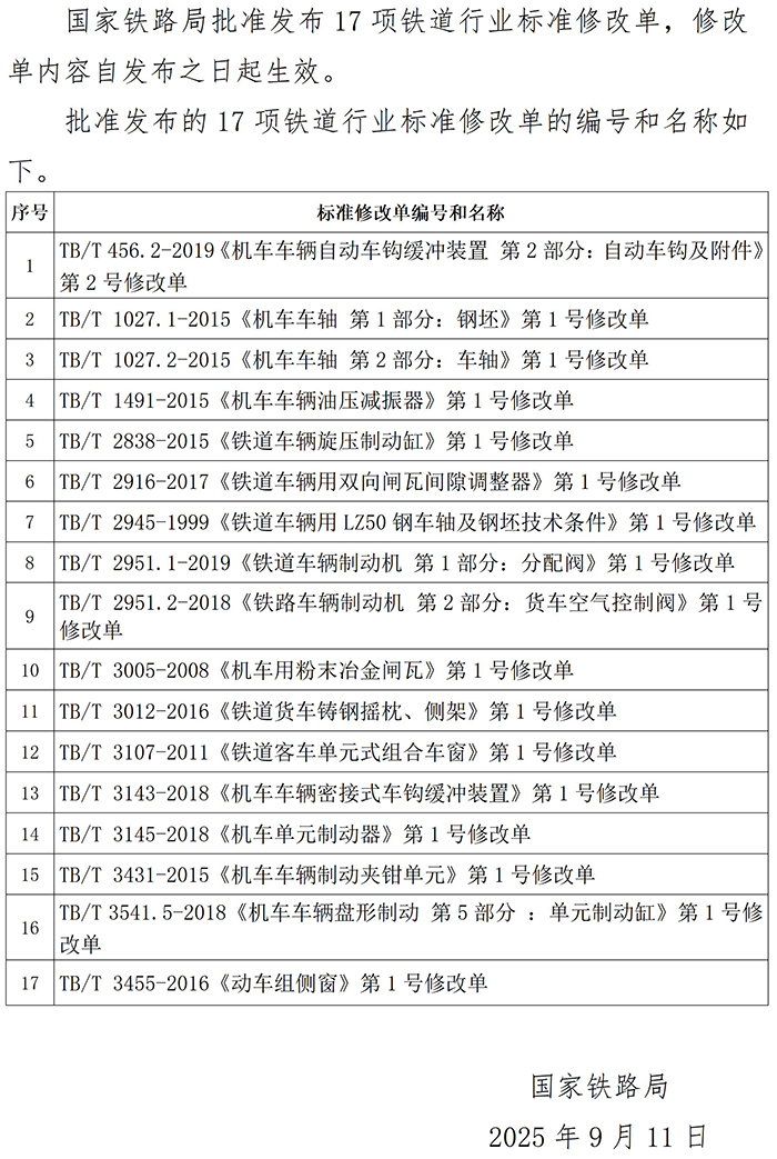 國家鐵路局關于發布鐵道行業標準的公告(技術標準2025年第6批)